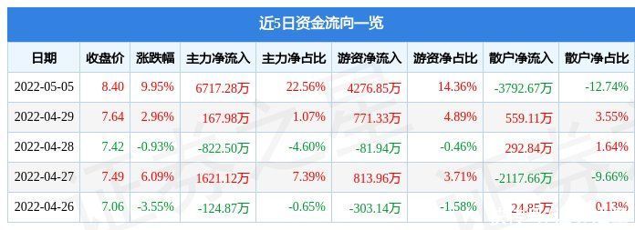 资金流向数据方面,5月5日主力资金净流入6717.28万元,游资资金净流入4276.85万元,散户资金净流出3792.67万元。